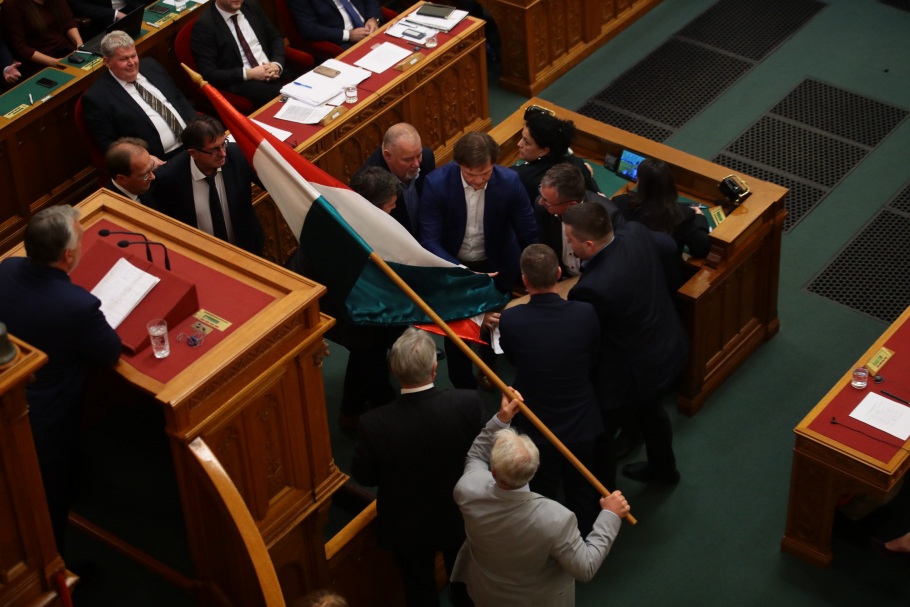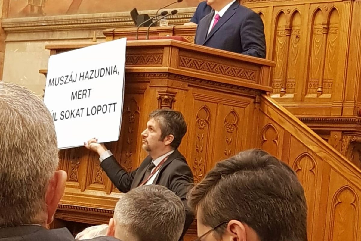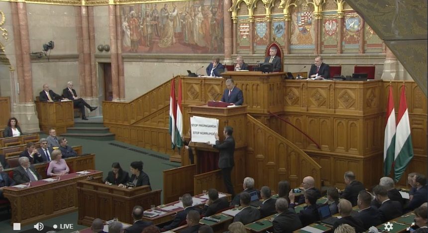 Mint ismeretes Hadházy Ákos, jelenleg független képviselő obszcén mondattal ékesített táblát tartott a pulpitus fel Orbán Viktor miniszterelnök beszédekor. A táblát a miniszterelnök is ki akarta venni Hadházy kezéből, de a végén több kormánypárti képviselő erőszakkal vette ki Hadházy kezéből a táblát.