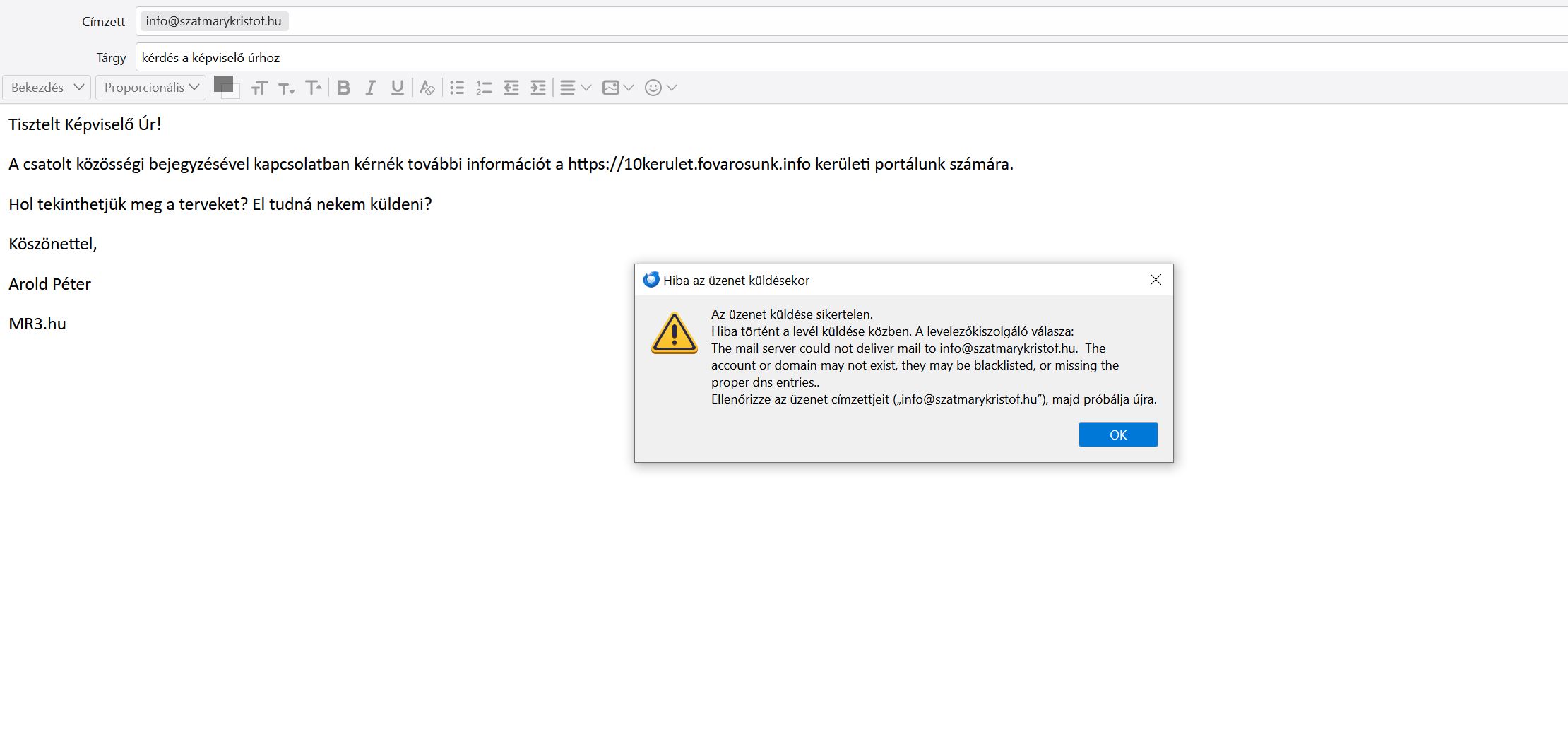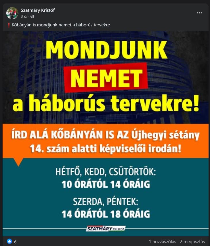 - Én megpróbáltamArold Péter Szatmáry Kristóf Képviselő Úr úgy véli, hogy vannak „háborús tervek”. Nos, én megprobálok azokba a tervekbe beletekinteni, hogy eldönthessem, mit tartalmaz. Ennek érdekében levelet írtam Szatmáry Úr hivatalos levelezési címére, de olyan a levelező kliensem szerint nincs, vagy tönött a posta ládája, esetleg akármi, vagy valami. A képviselő Úr, aki inkább Zugló, mint
