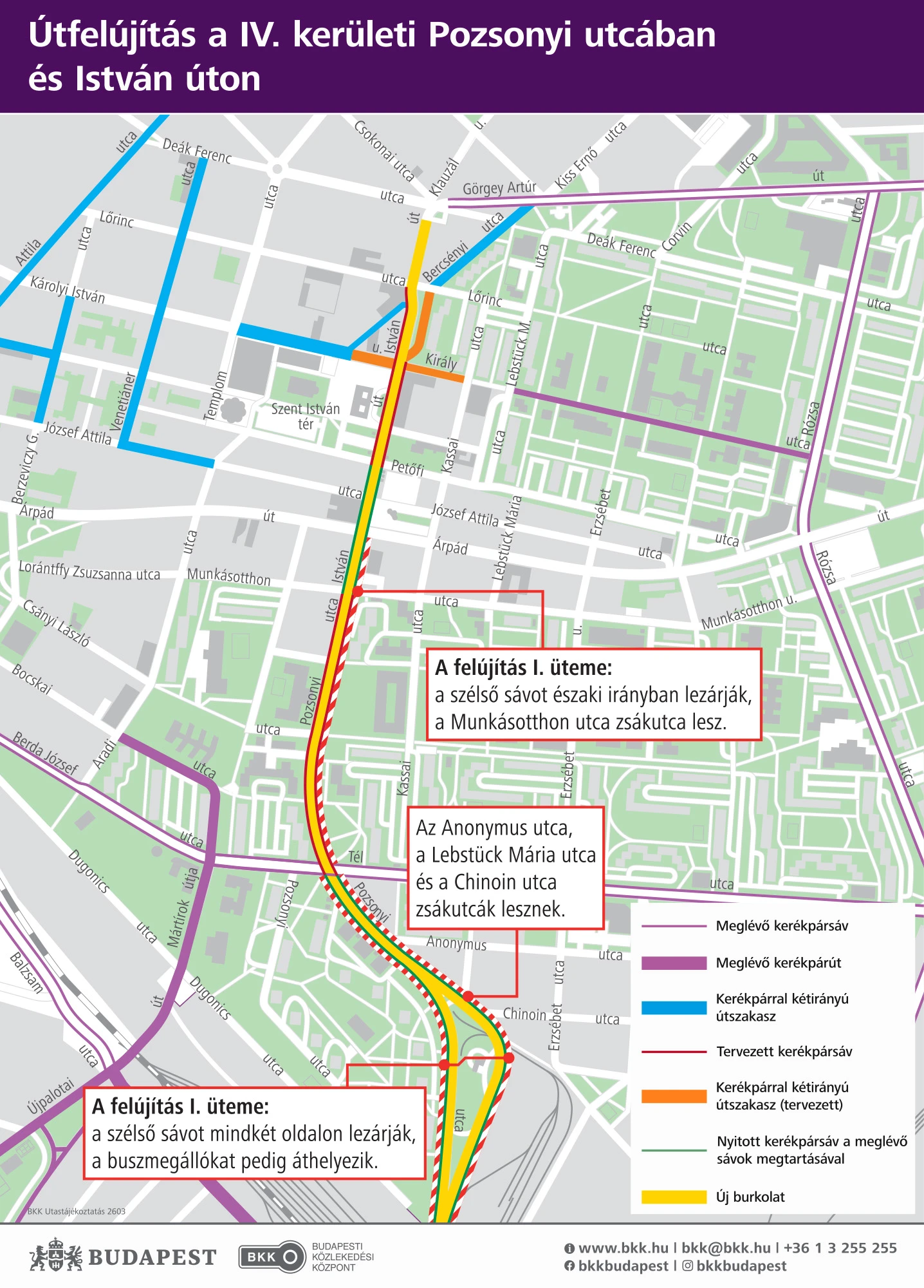 A kivitelező már átvette a munkaterületet, és megkezdte az előkészületeket. A beruházás hónapokra jelentősen átalakítja a forgalmi rendet: az első ütemben a Pozsonyi utca Madridi út és Tél utca közötti szakaszán – mindkét oldalon –, valamint a Pozsonyi utca Árpád út és Tél utca közötti részén, az Újpest-központ felé vezető oldalon a szélső forgalmi sávban kell ideiglenesen forgalomkorlátozásokra és hosszabb menetidőre számítani.