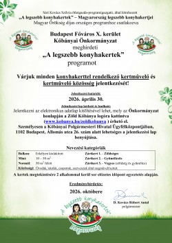 Budapest Főváros X. kerület Kőbányai Önkormányzat meghirdeti „A legszebb konyhakertek” programot. Várjuk minden konyhakerttel rendelkező kertművelő és kertművelő közösség jelentkezését! Jelentkezési határidő: 2026. április 30. Nevezési kategóriák: Balkon: Erkélyen kialakított Zártkert 1. – ZöldségesMini: 10 – 50 m2 Zártkert 2. – GyümölcsösNormál: 50 m2 felett ...
